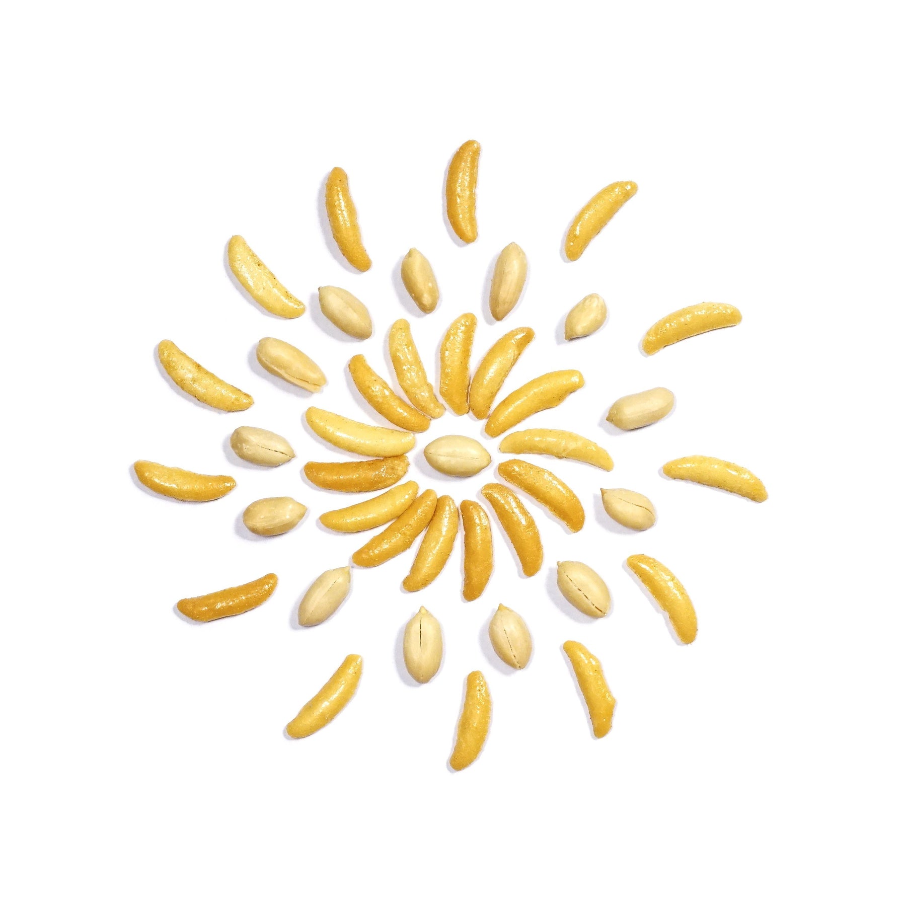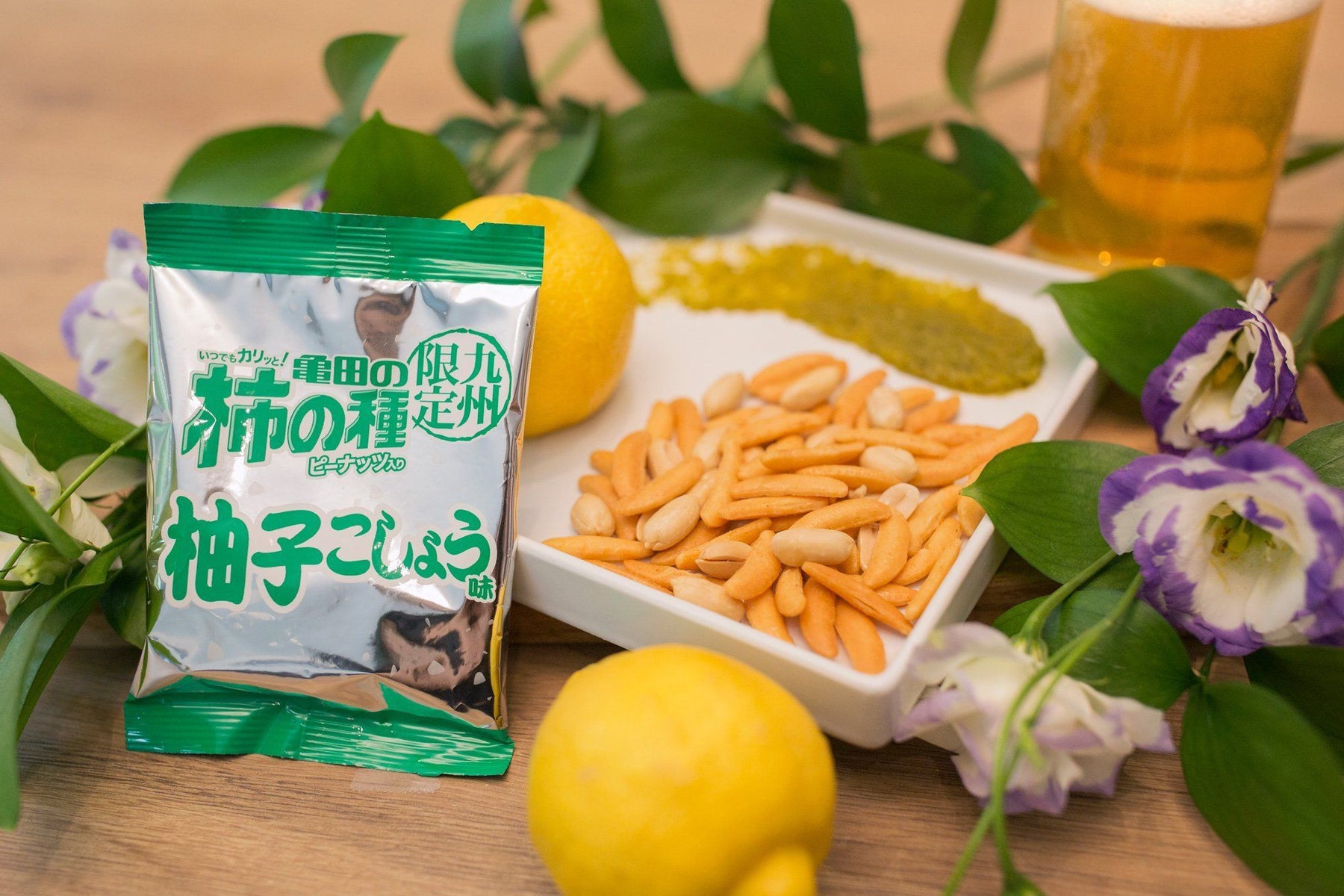 Typically enjoyed with beer, Kakinotane is a popular snack mix of peanuts and crescent-shaped senbei. Yuzu and Pepper make for a great combination in these rice crackers. The pepper adds a kick while the yuzu from Oita brightens the flavor with its citrus notes and balances out the richer nutty flavor of the peanuts.
