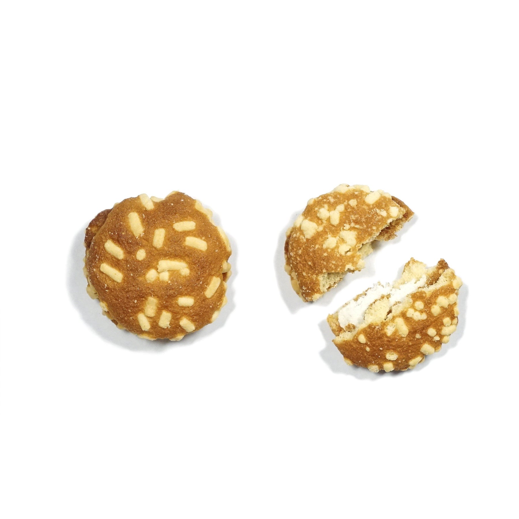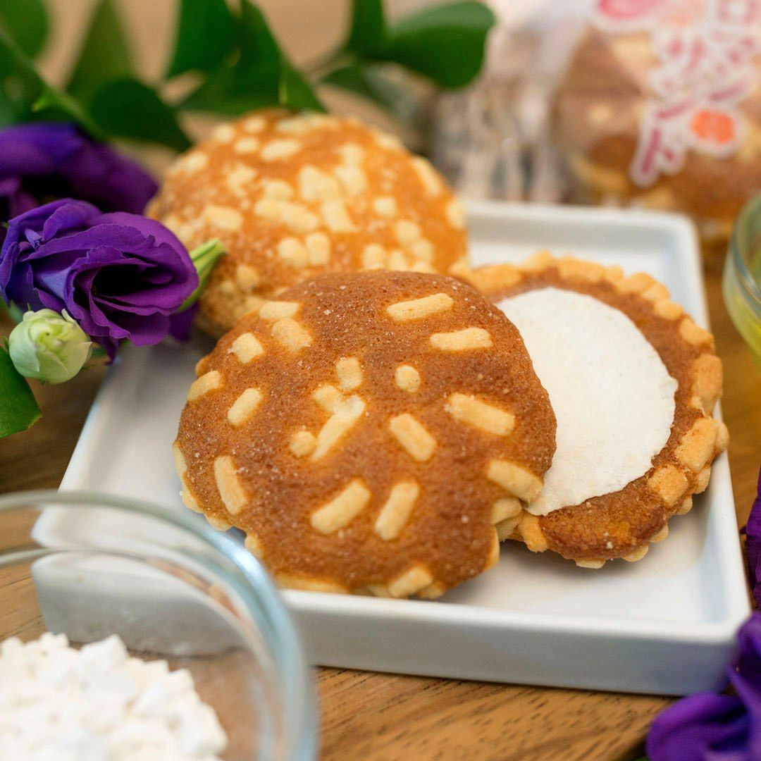 The cake-like biscuits of this Romance Sandwich are flavored with honey and baked with sugar pearls sprinkled on top, creating a crunchy texture. In between is a thin layer of sugar-paste filling. This fun sandwich cookie is commonly given as an omiyage (souvenir) from Nagasaki, because what better way to tell someone you're sweet on them than gifting a Romance Sandwich?
